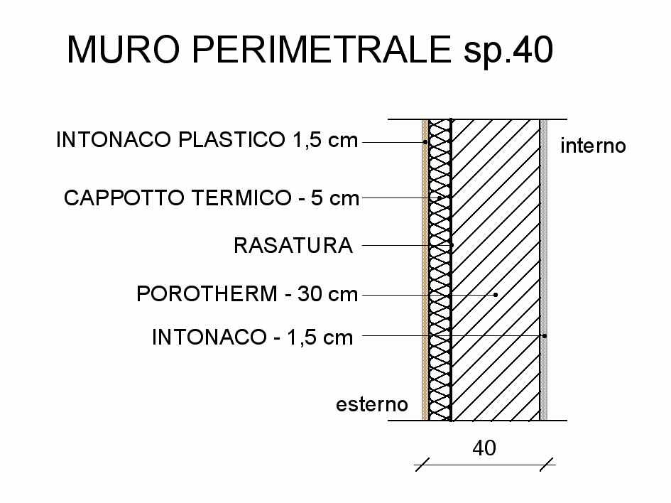La muratura di tamponamento perimetrale è stata realizzata con blocchi semipieni di laterizio tipo Porotherm intonacato internamente, mentre all’esterno si trova PVC in fogli,cappotto in polistirene ed intonaco con finitura a fino.